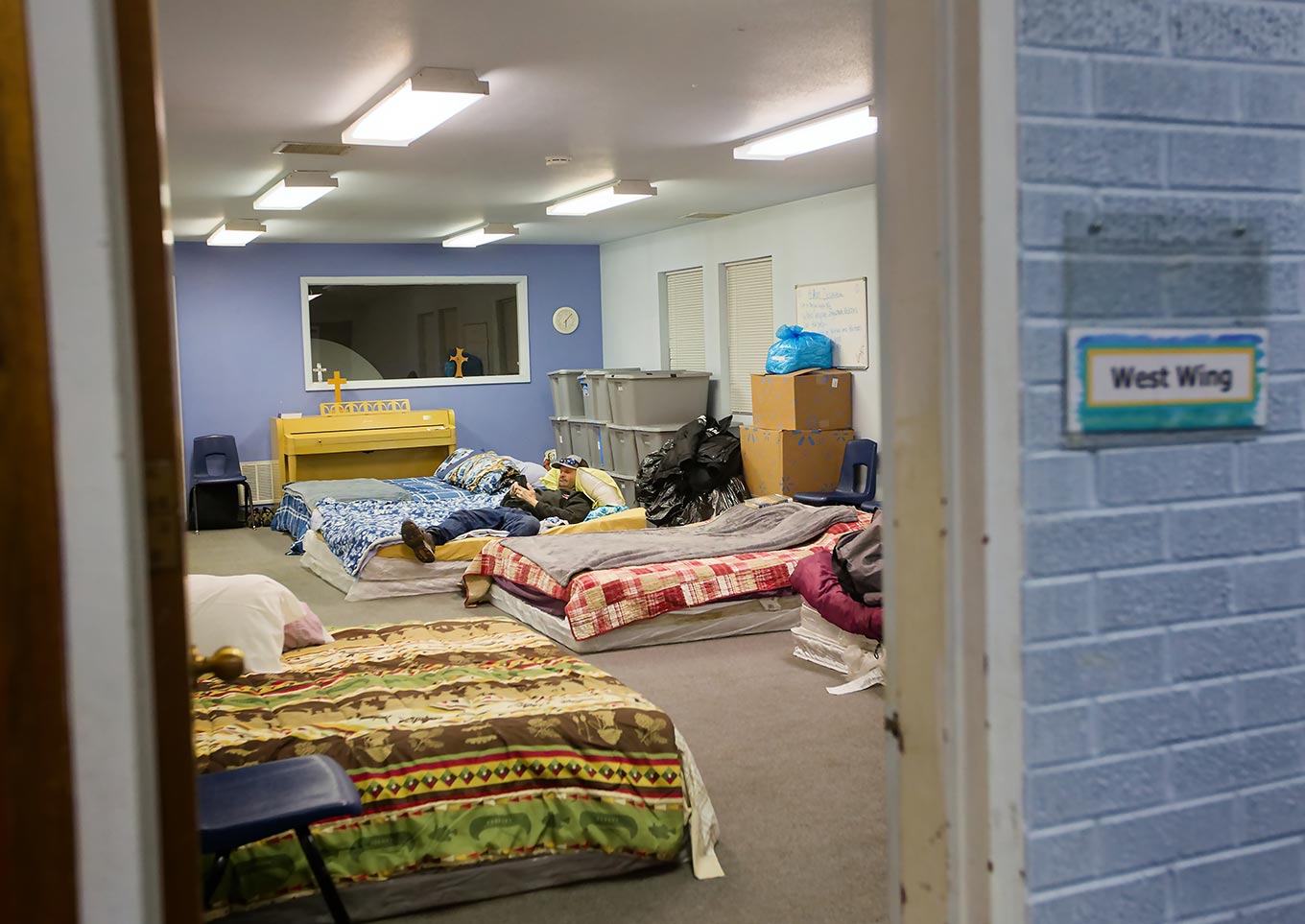 The mattresses spread out on the floor in the photo above are ready for unhoused guests staying at the temporary Winter Emergency Shelter (WEShelter) site on Wednesday, Jan. 14, 2026, at First Christian Church in Grand Junction, Colo. James, who declined to provide his last name, scrolls on his phone before going to sleep. The Peace and Justice Center runs the overnight WEShelter program, which the Center for Independence and four local churches take turns hosting. Photo by Barton Glasser / Special to The Colorado Trust