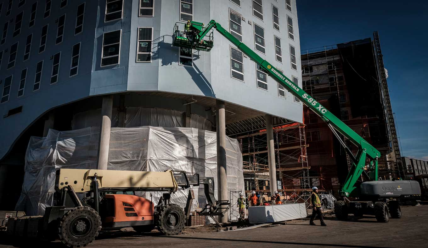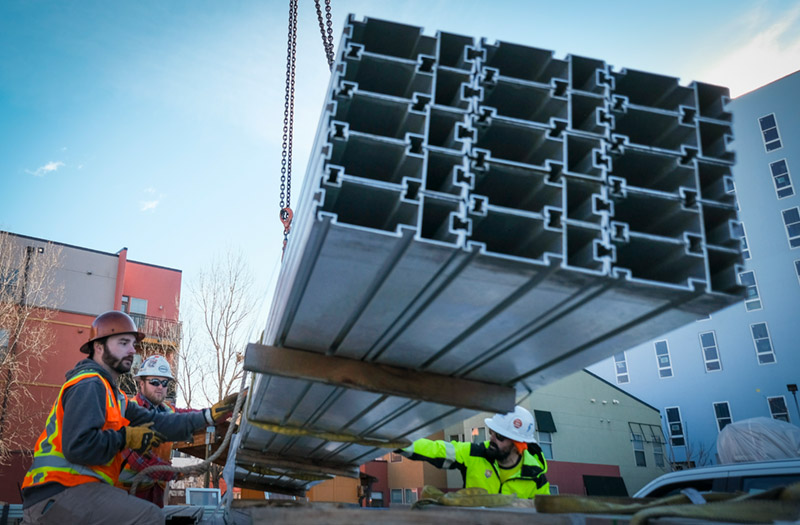 Riggers with RMS Cranes, left, move beams with Luke Crawford of Vanguard Solar Services, right, on Wednesday, Jan. 14, 2026, before placing them at a solar array atop the affordable housing development at 9th Avenue and Navajo Street in the La Alma-Lincoln neighborhood in Denver, Colo. Photo by Joe Mahoney / Special to The Colorado Trust