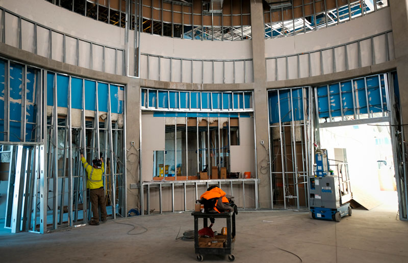 A worker installs metal framing in the main meeting room in the Cranes Landing housing development, on Wednesday, Jan. 14, 2026, in the La Alma-Lincoln neighborhood in Denver, Colo. The affordable housing project will include 190 units, primarily for serving American Indian and Alaska Natives. Photo by Joe Mahoney / Special to The Colorado Trust