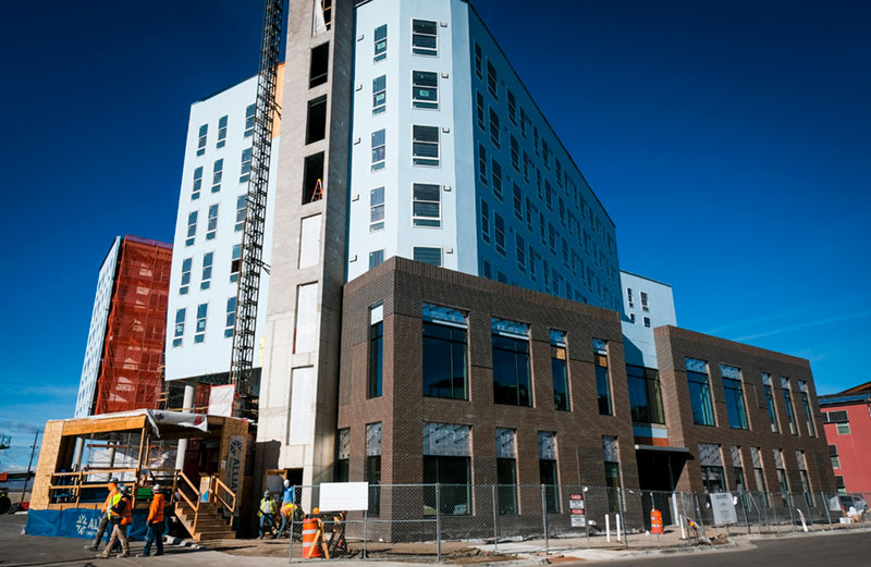 In mid-October, a multistory building stood where the white tent had once been, the light blue of drywall being installed adding a touch of color to the construction site. When it’s completed, the façade of 901 Navajo will mimic the geometric patterns seen on Native American blankets (a design finalized with input from Cheyenne and Arapaho tribal members) and encircle a green space—offering a safe place for residents to connect with Mother Earth.